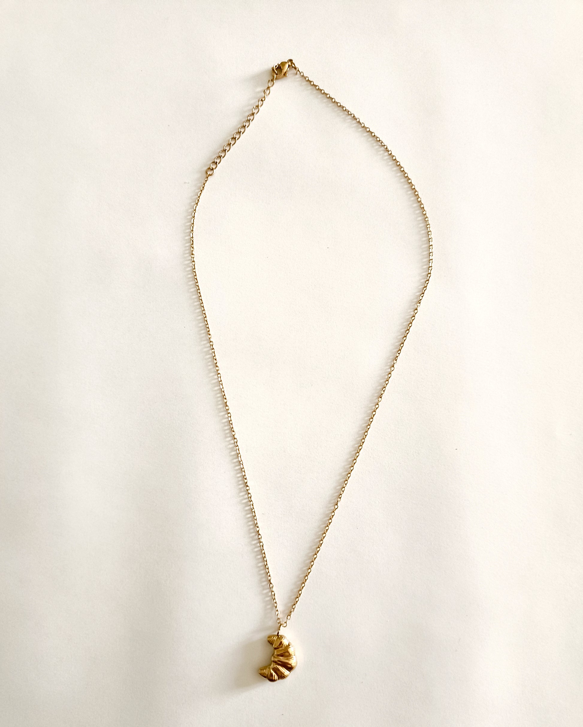 Un’elegante collana con catenina fine e ciondolo a forma di croissant, realizzata in acciaio inox resistente e lucido. Perfetta per aggiungere un tocco gourmand e sofisticato al tuo stile quotidiano.