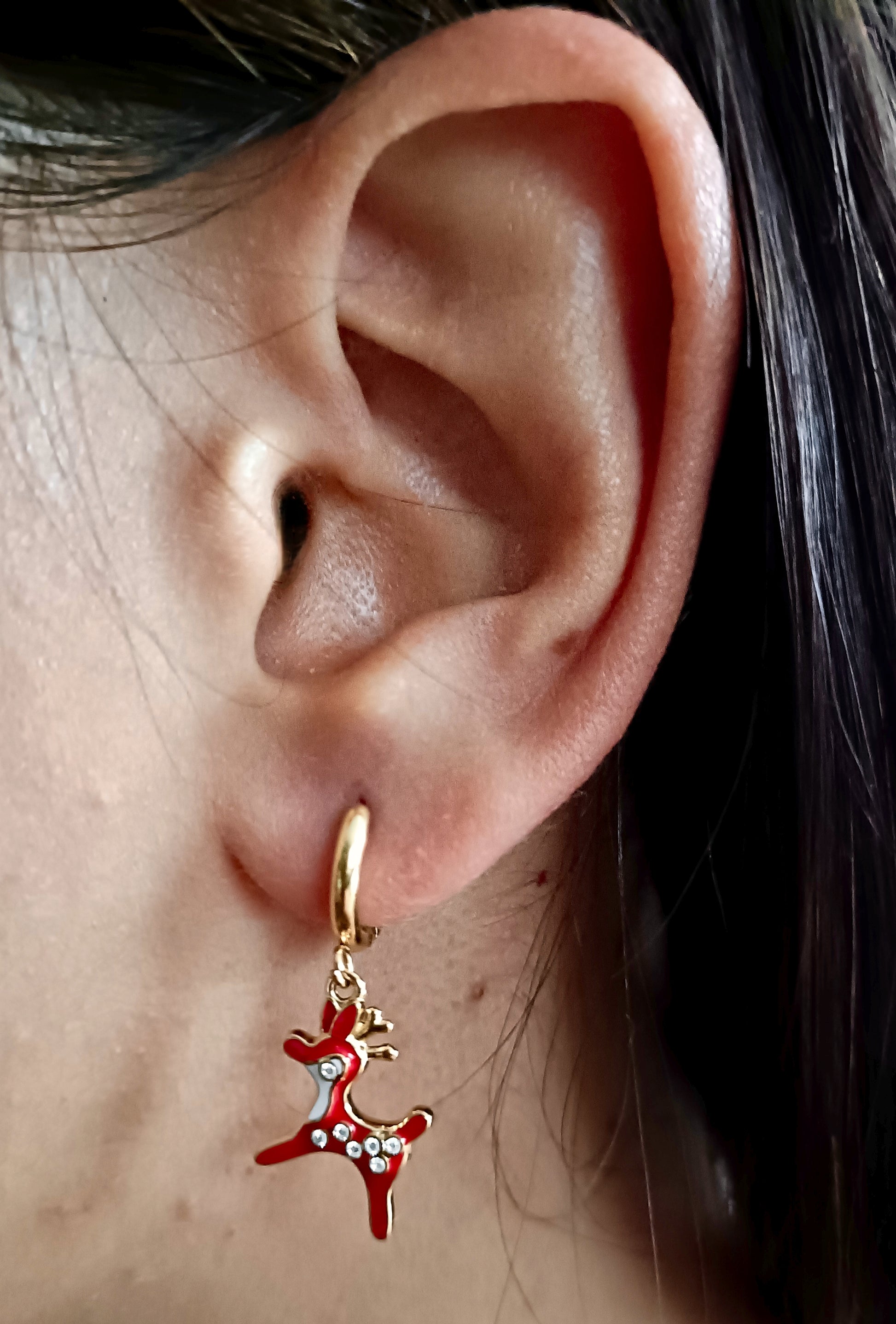 Il design presenta una renna in movimento con linee eleganti e minimaliste, smaltata in rosso vivace con dettagli di cristalli bianchi che creano un fiocco decorativo. Versatile e intercambiabile, si adatta perfettamente ai tuoi orecchini a cerchio, bracciali e collane Dispetti.